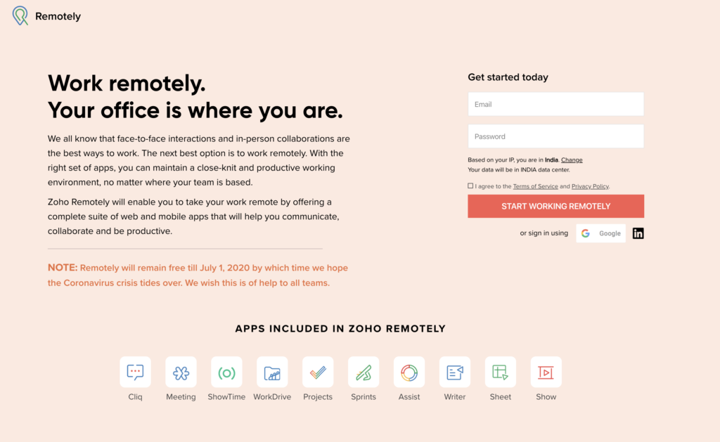 Zoho is offering a free remote working software called ‘Zoho Remotely‘ which will enable the remote workers to be more productive, reliable and quick during this COVID-19 situation. With Zoho Remotely comes ten different applications at no additional cost until July 1st, 2020. Zoho is offering Cliq, Meeting, Showtime, Workdrive, Projects, Sprints, Assist, Writer, Sheet and Show in this Zoho Remotely bundle. Zoho believes this could facilitate the startups big time compared to other options in the market.